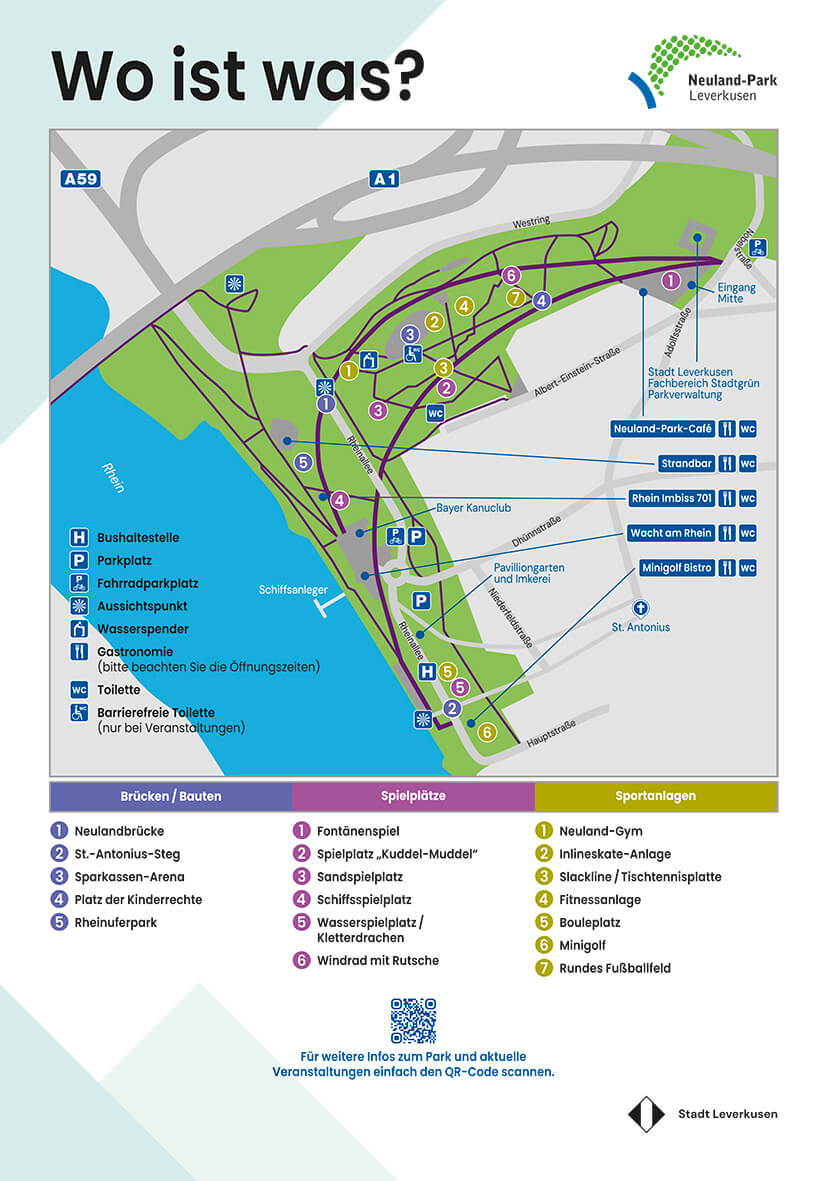 Sowohl entlang des Rheins als auch aus Richtung Wiesdorf und Bürrig ist der Neuland-Park hervorragend über ausgeschilderte Radwege zu erreichen.